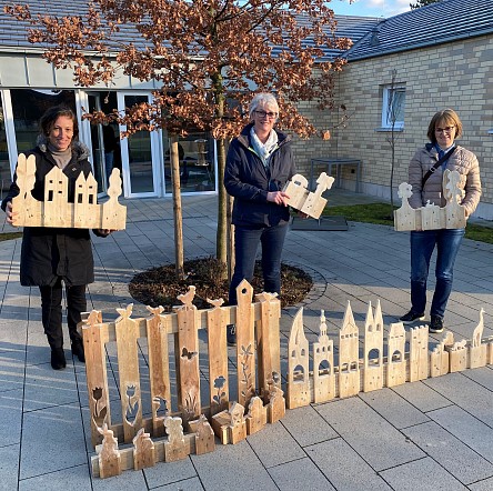 Aus alten Europaletten können schöne neue Dinge entstehen, weiß Silke Hautkapp. Mit viel Kreativität und Säge zaubert Hautkapp in ihrer Freizeit aus den Paletten Frühlingswiesen, Weihnachtskrippen, Wildtiere oder auch das Soester Stadtbild. Einige dieser „Palettenbilder“ überreichte Hautkapp (rechts im Bild) Anfang März an Einrichtungsleitung Angelika Köster (mitte) und Fundraiserin Claudia Wolf. Die Paletten sind nun im Christlichen Hospiz Soest ausgestellt und für eine Spende von rund 50 Euro zu haben.