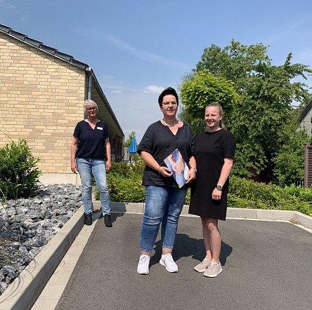Im Bild: Einrichtungsleitung Angelika Köster (links) hält den Corona-gebotenen Mindestabstand von Nicole und Viktoria Margott.