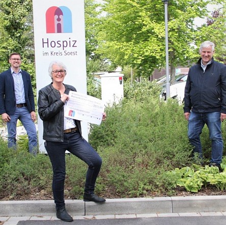 Schön, wenn jeden Monat Gehalt auf dem Konto ist – und besonders schön, wenn der Lohn der eigenen Arbeit auch anderen zu Gute kommt. Etwa den Gästen des Christlichen Hospiz. Die Mitarbeitenden des Marienkrankenhauses Soest haben jeden Monat etwas vom eigenen Gehalt für einen guten Zweck beiseitegelegt. Nach einem Jahr hat die Geschäftsführung den Betrag verdoppelt und die Mitarbeitenden haben abgestimmt, wohin ihre Spende gehen soll. Gewinner: das Christliche Hospiz Soest. Ergebnis ist ein Scheck über stolze 2975,38 Euro, den Einrichtungsleitung Angelika Köster und Geschäftsführer Sebastian Thiemann am 8. Mai entgegen nahmen – im durch Corona gebotenen Mindestabstand. "Wir wissen aus unserer beruflichen Erfahrung, wie viel gute und enge Begleitung den Sterbenden und Angehörigen bedeutet und schätzen daher die Arbeit des Hospiz sehr", sagt Andreas Mattern, Vorsitzender der Mitarbeitervertretung des Marienkrankenhauses.